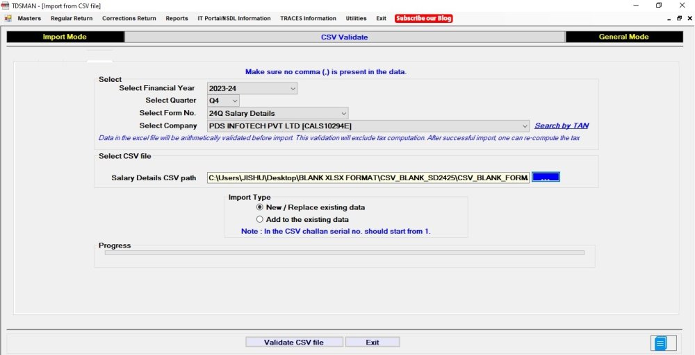 On the same interface as above, select the CSV formats in Challan and Deductee file path section and choose the relevant ‘Import Type’ applicable. Click on ‘Validate CSV File to proceed with the data validation as provided in the CSV formats. In case of errors encountered, it will be listed out in a HTML file.