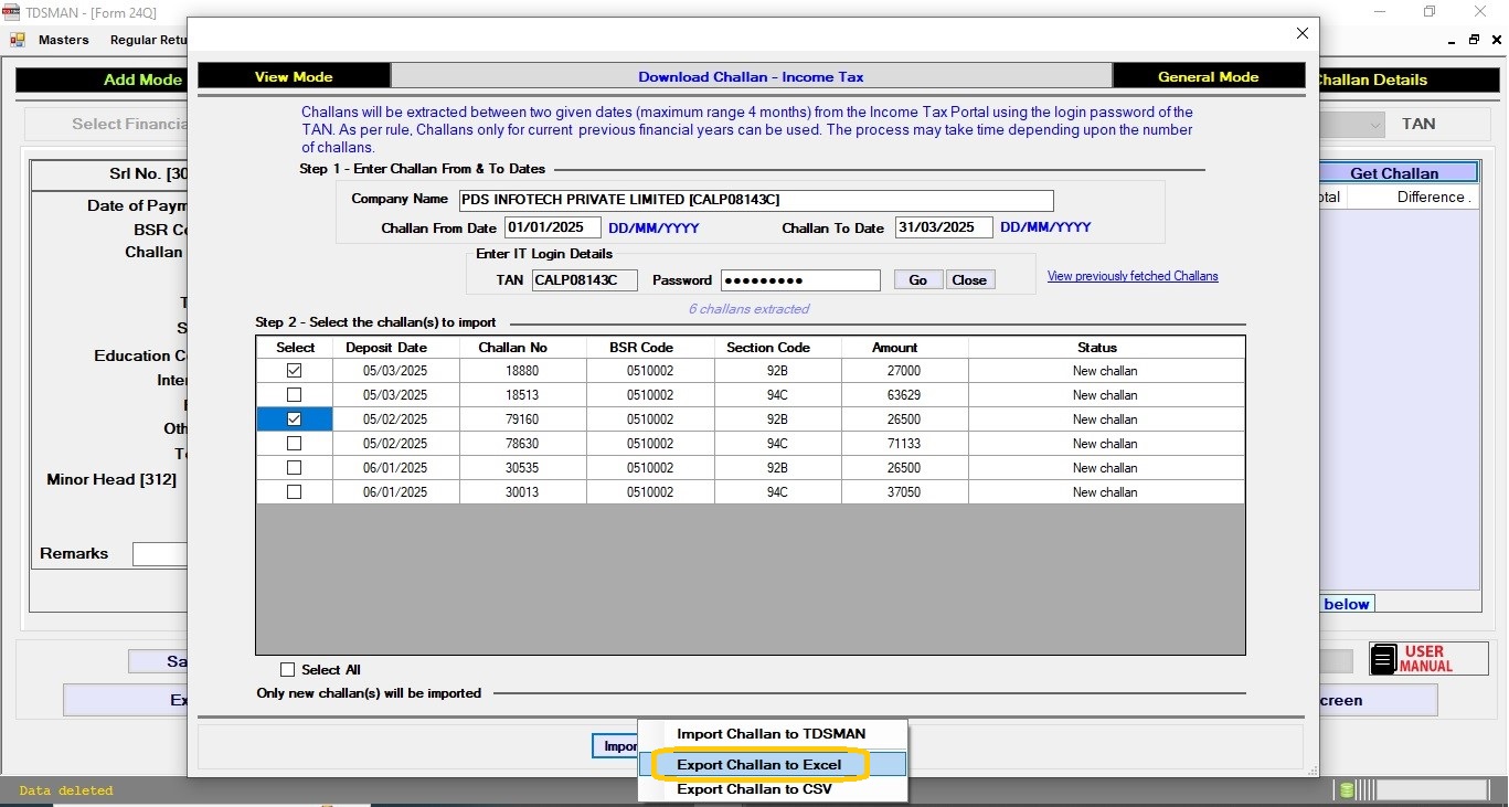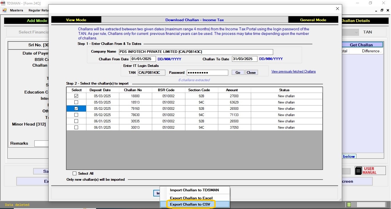 Note: Whenever a challan is deleted, then all the deductees present in that challan will also subsequently get deleted.