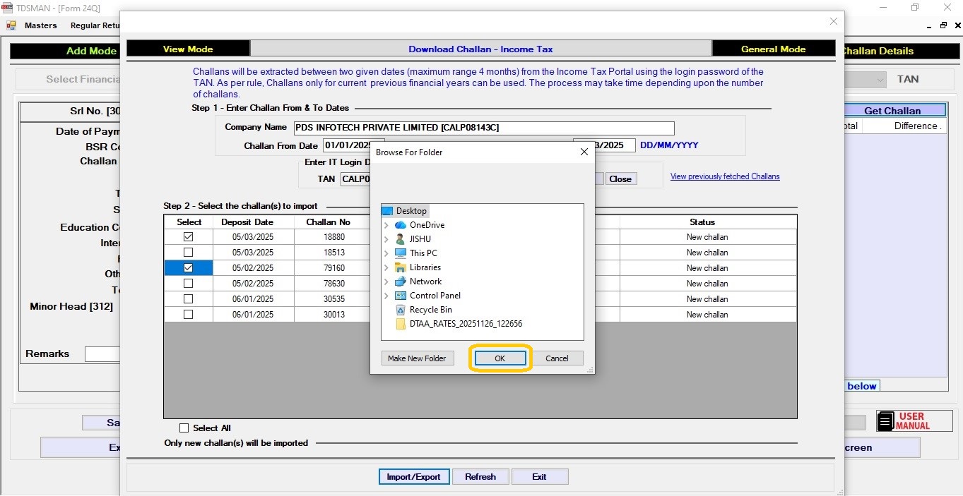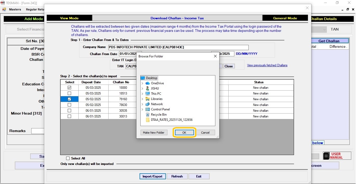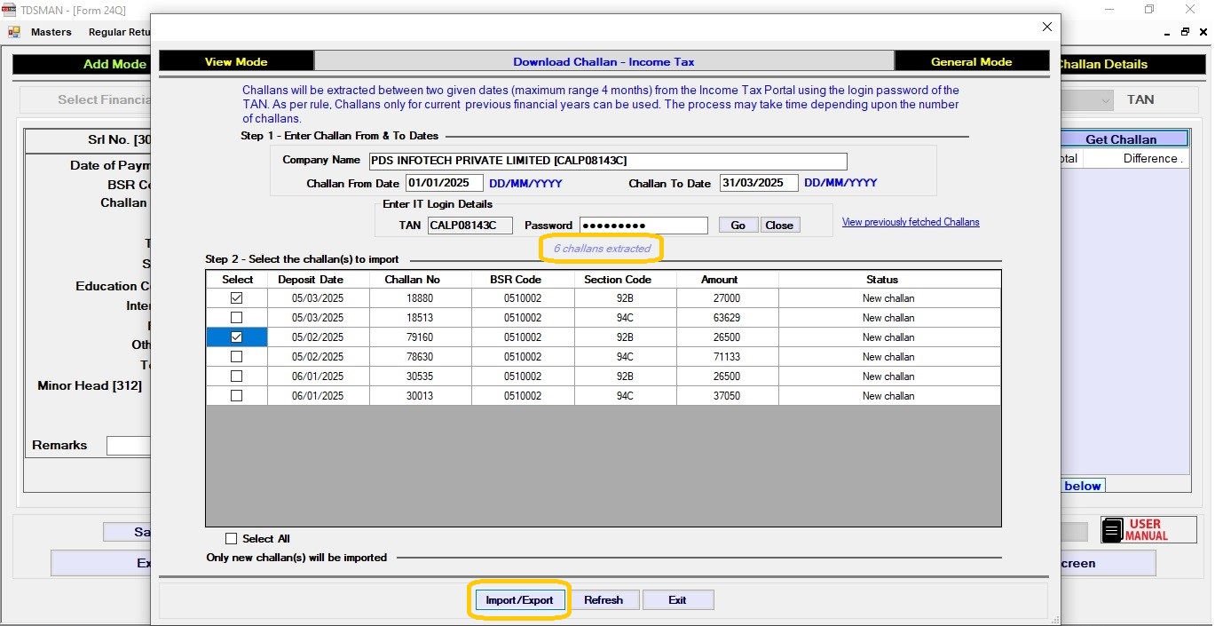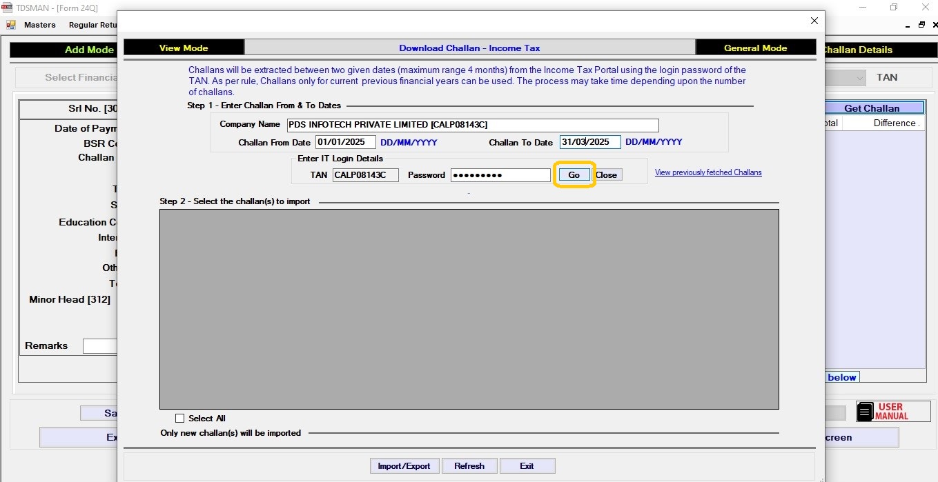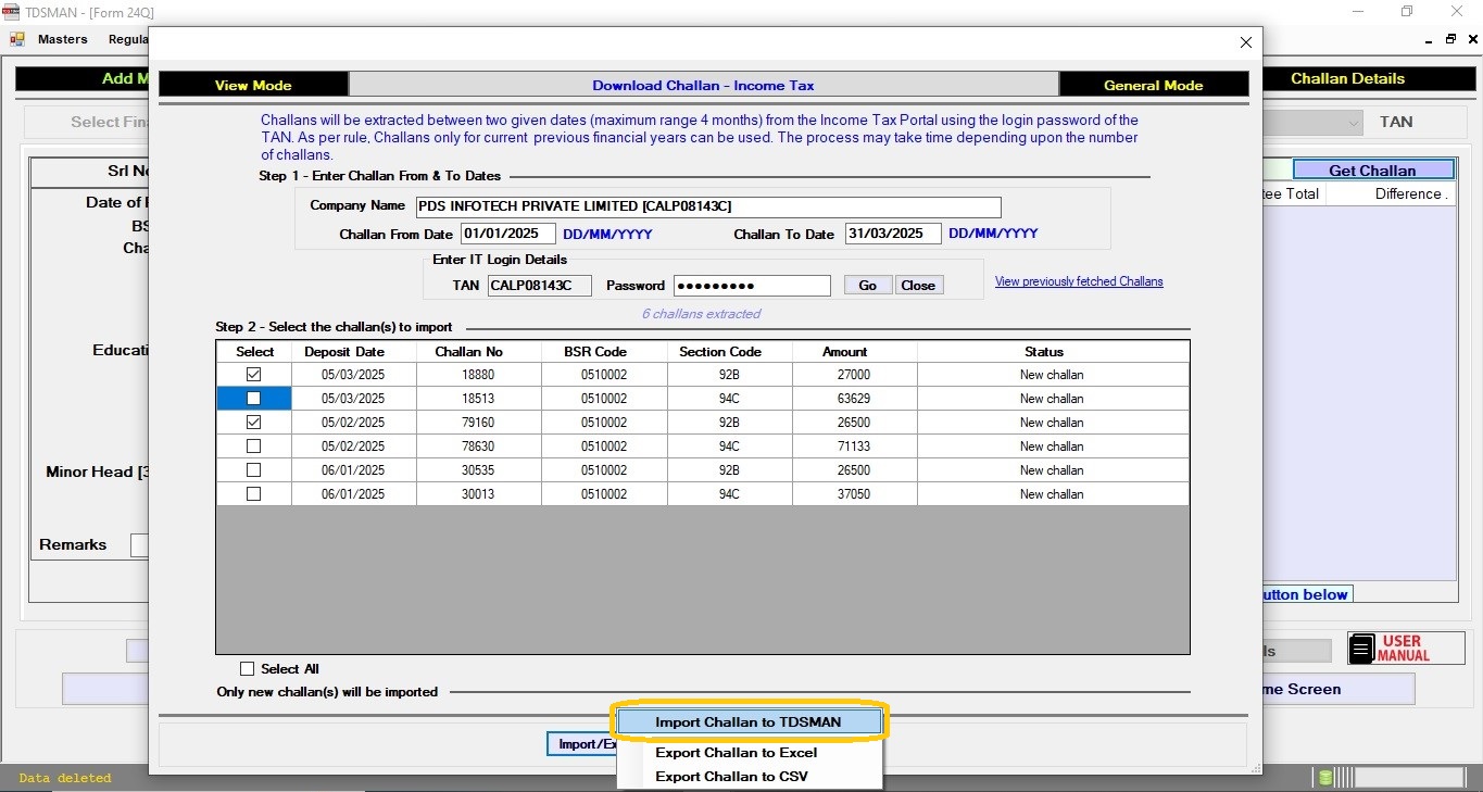 In order to import the challans to TDSMAN software directly click on ‘Import Challan to TDSMAN’ :