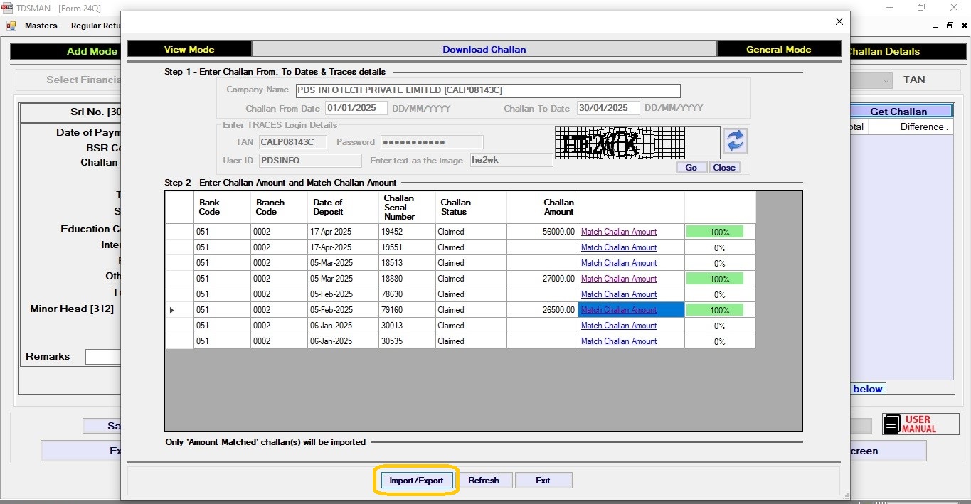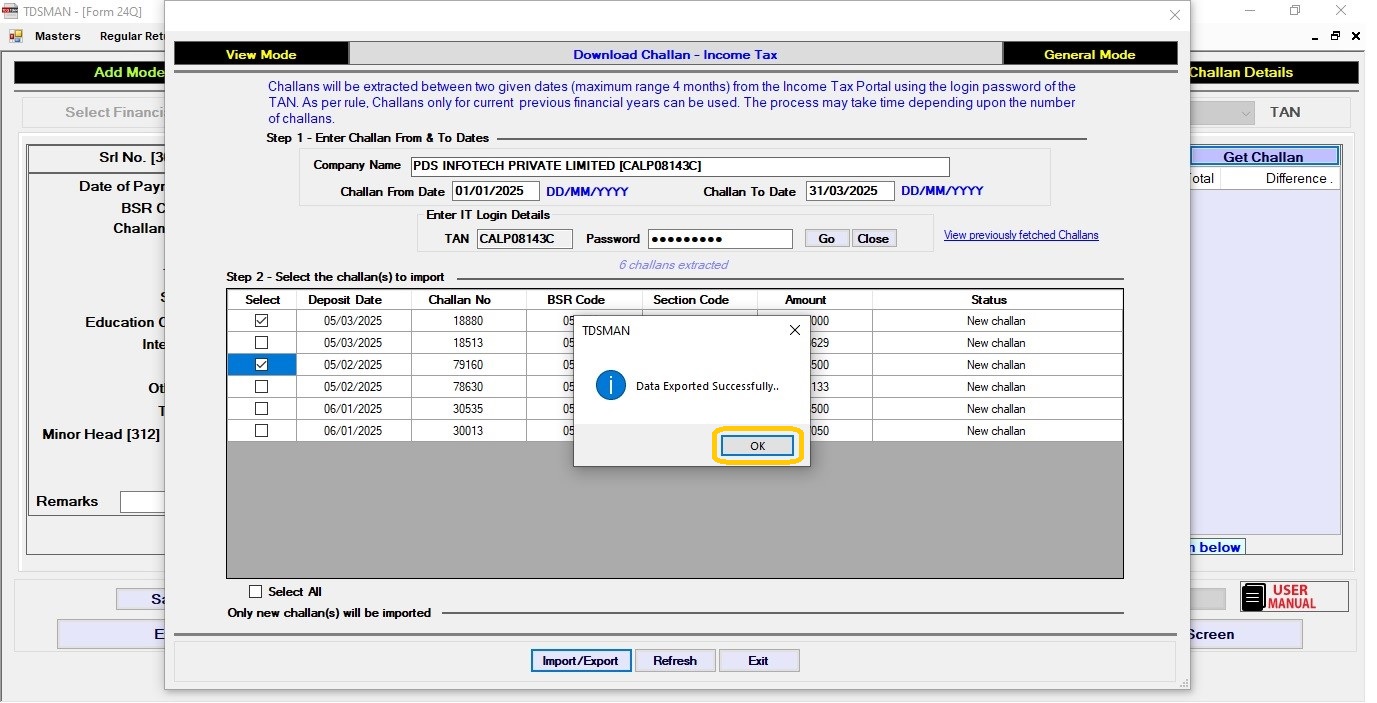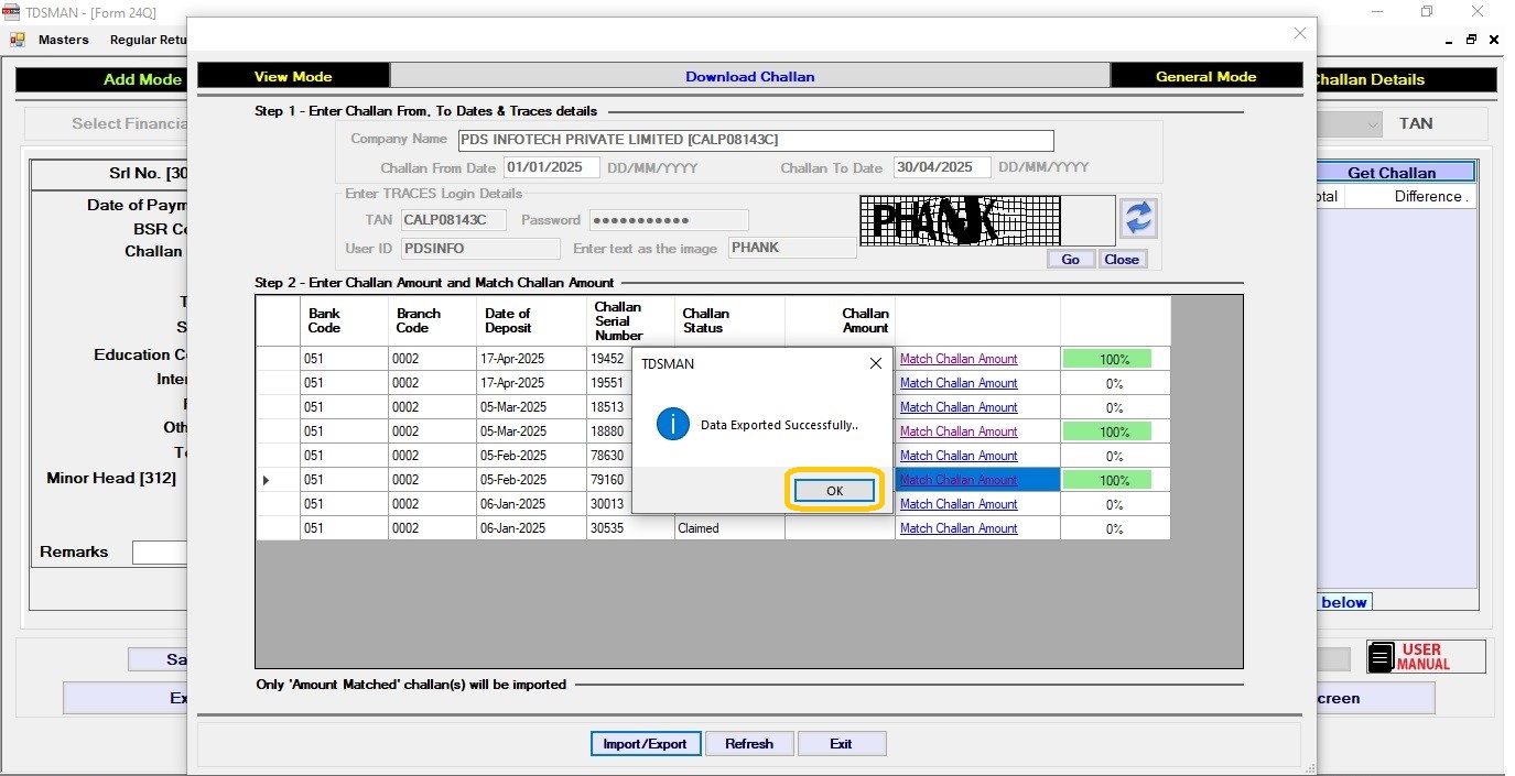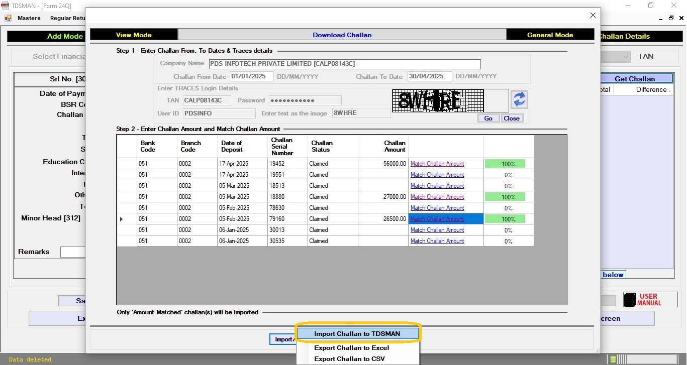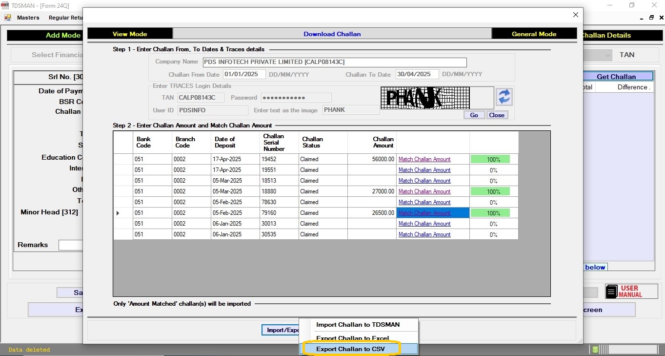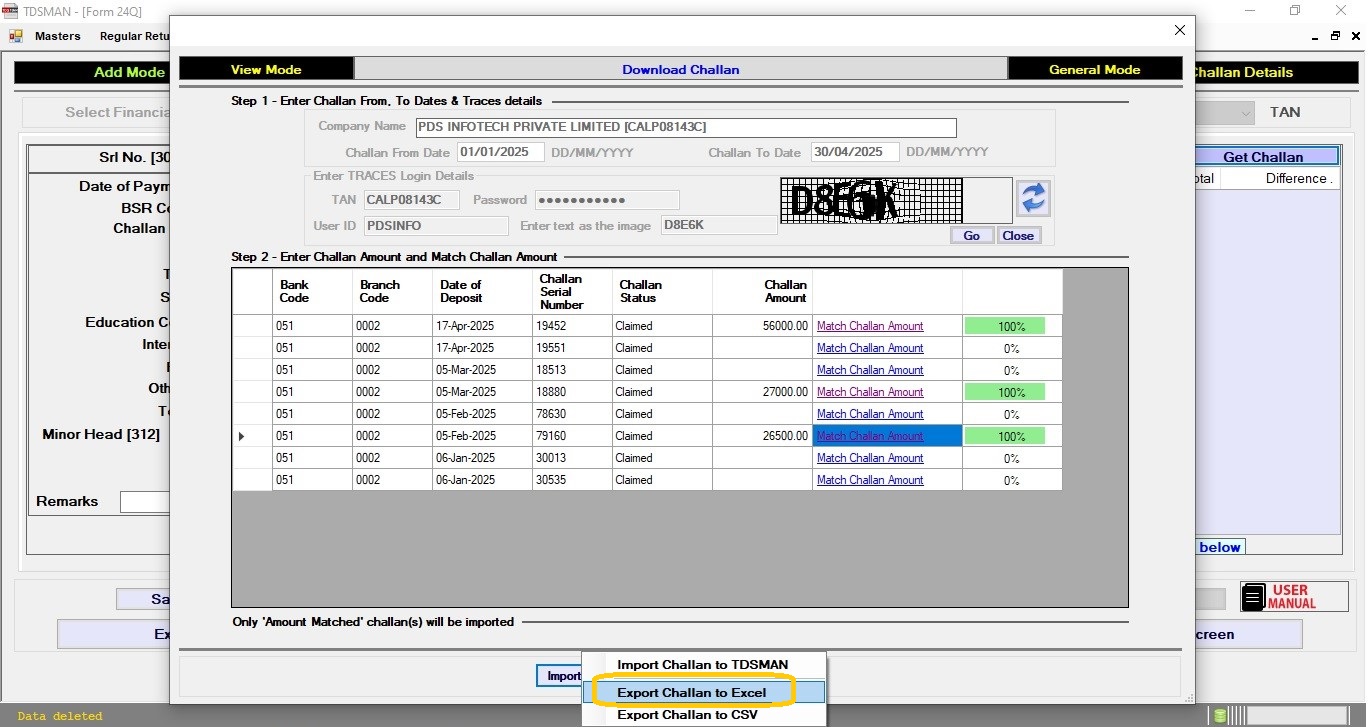 Once all your challan matched , either you can Import the challans directly into TDSMAN or you can export the data as Excel or CSV format