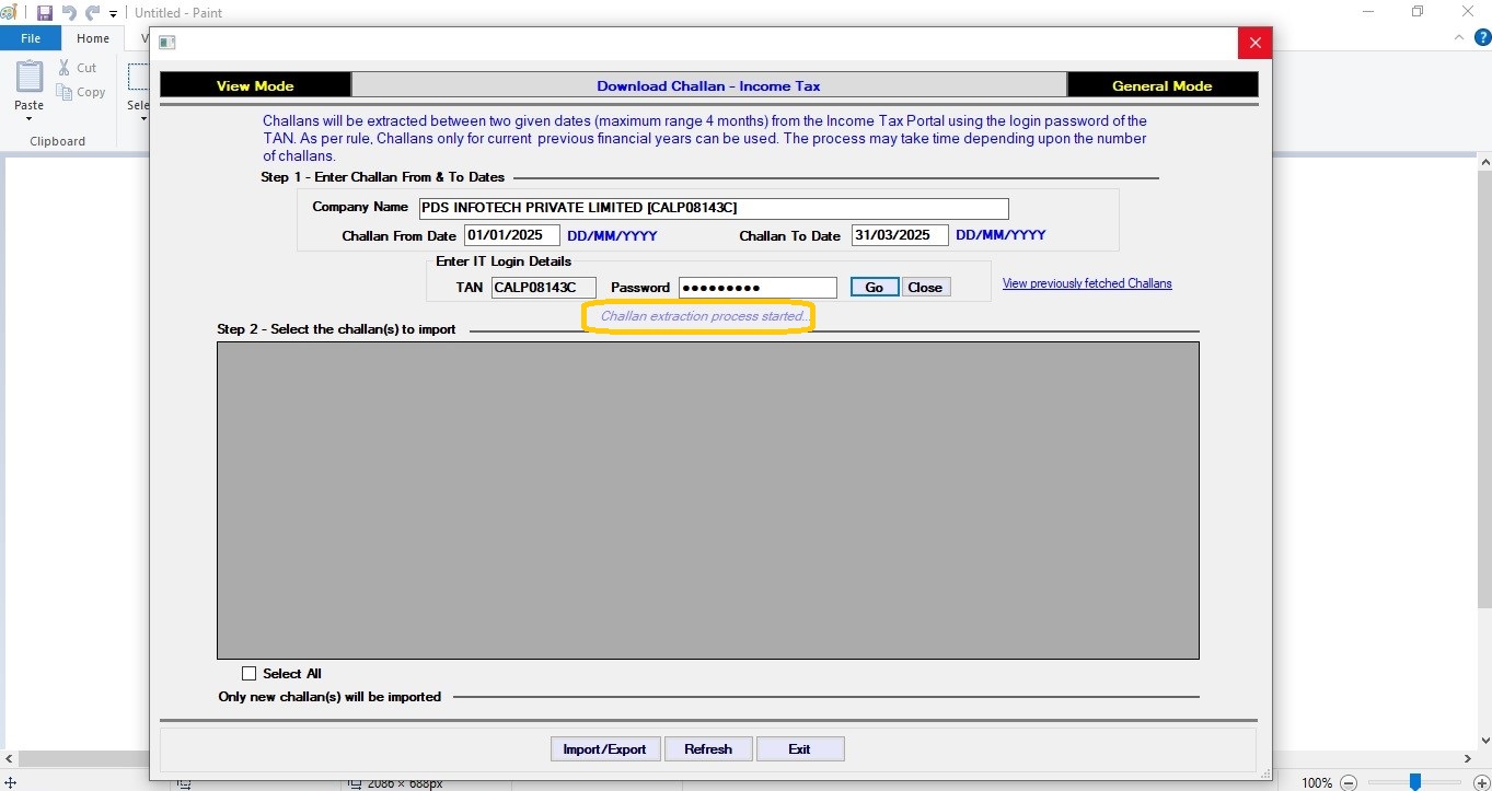 Enter the Date Range i.e. the From Date and the To Date, for which the challans have to be extracted. Once the credentials of TRACES is validated, click on ‘Go’ , the process commences and the extracted challans can be viewed in the interface below: