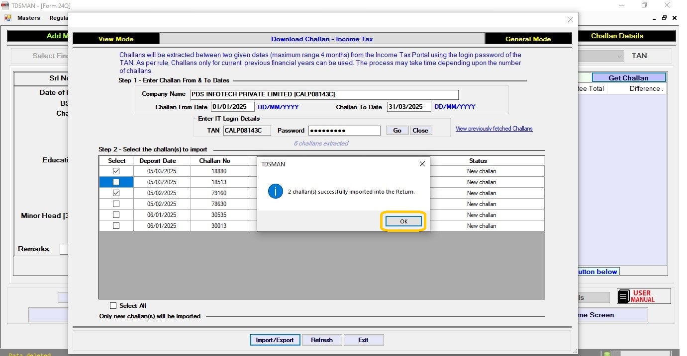 Once the challans got imported in TDSMAN successfully , following screen will come, Click on ‘ok’ :