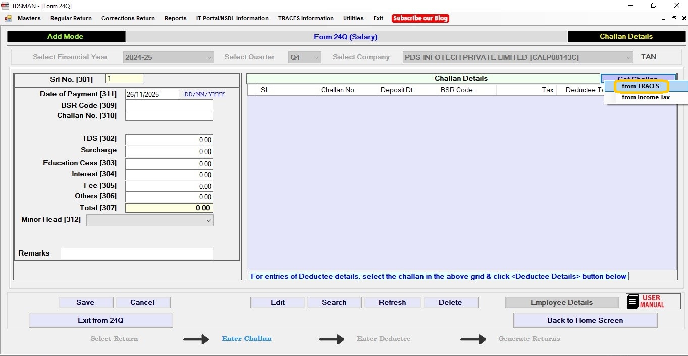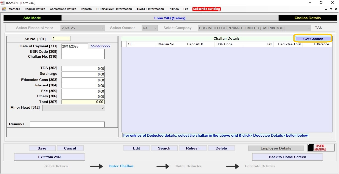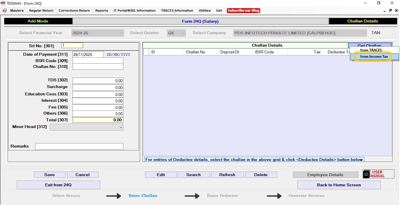 For all the TDS Deductions of the deductees made by the company/deductor challans are submitted. These challan and deductee details form the building blocks for the preparation of the return and are entered over here.