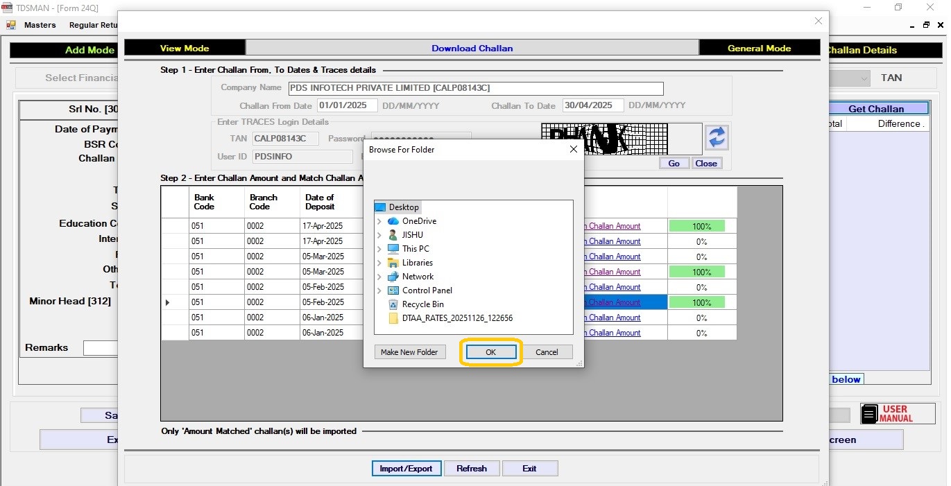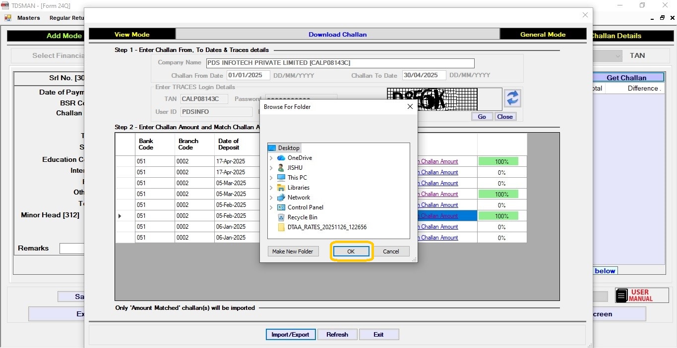 In order to import the challans you matched to TDSMAN software directly click on ‘Import Challan to TDSMAN’ :