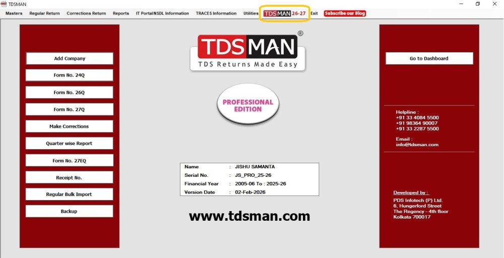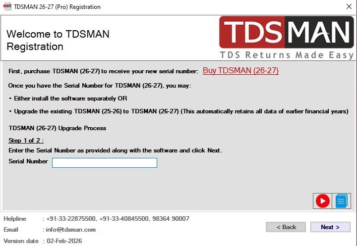 In this case in order to upgrade from financial year 25-26 to the next financial year i.e. 26-27, click on ‘TDSMAN 26-27’
