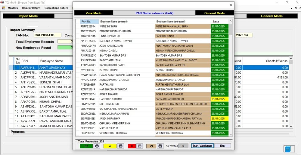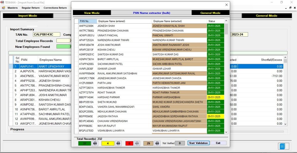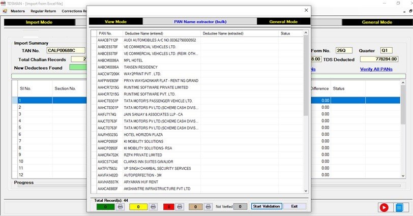 The relevant PAN with the Deductee Names, as entered in the system, will get displayed. Click on ‘Start Validation’ .