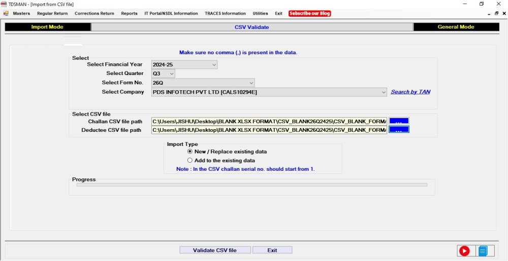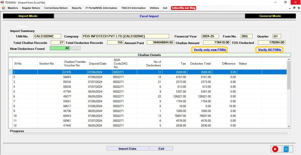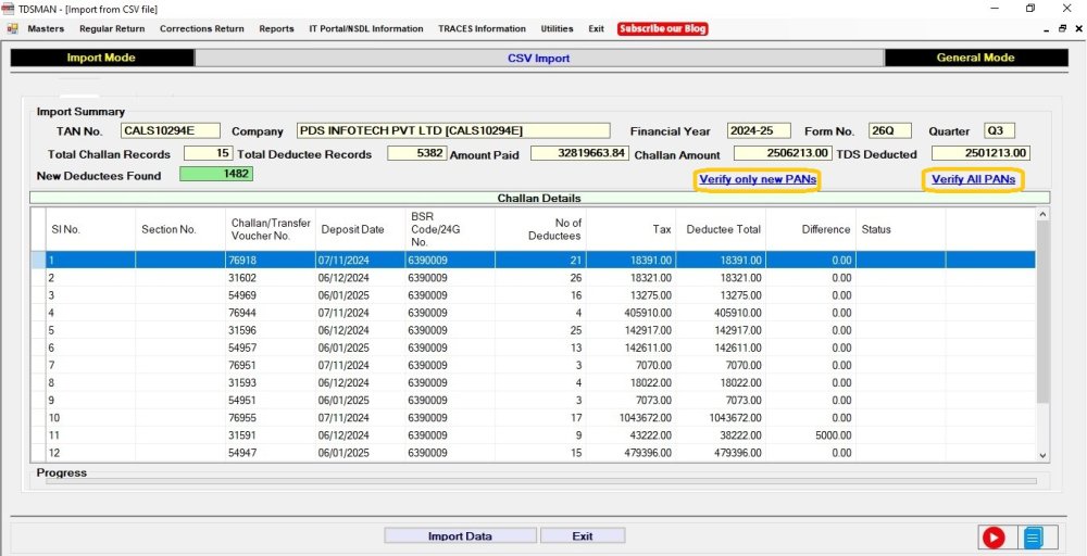 Provide the Challan details in the Challan CSV format and Deductee Details in the Deductee CSV format. Once these are ready, one is now ready to Import data.
