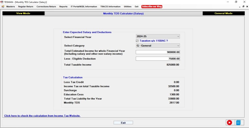 Select FA Year, category and enter the income. There is also an option to enter any eligible deduction if any. It will give the output of Monthly TDS.