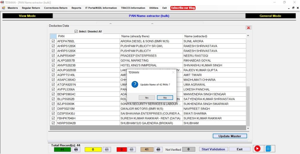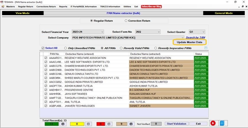 For all the PANs in brown, which indicates name mismatch, the name in the software can be replaced and updated with name recorded in the income tax department by clicking on it.