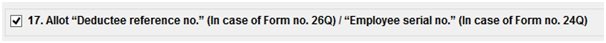 By default the system automatically allots the ‘Employee Serial No.’ for missing PAN. To ensure that it is not done automatically, one needs to un-check the box displaying, “Allot Deductee Reference No. (In case of Form no.26Q) / Employee Serial No.(in case of Form no. 24Q) automatically”.