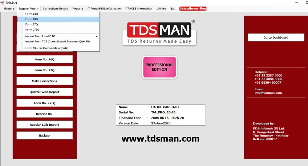 In order to select Form 26Q, click Form 26Q under Regular Return option as shown below: