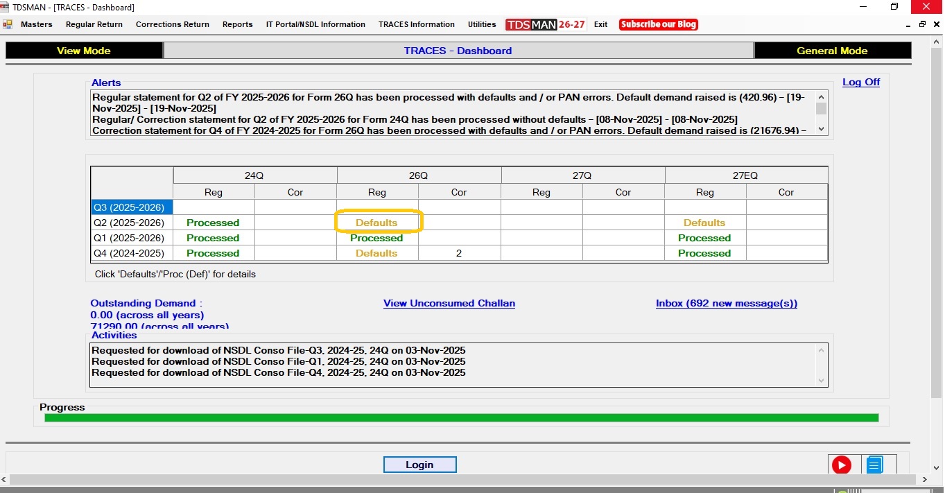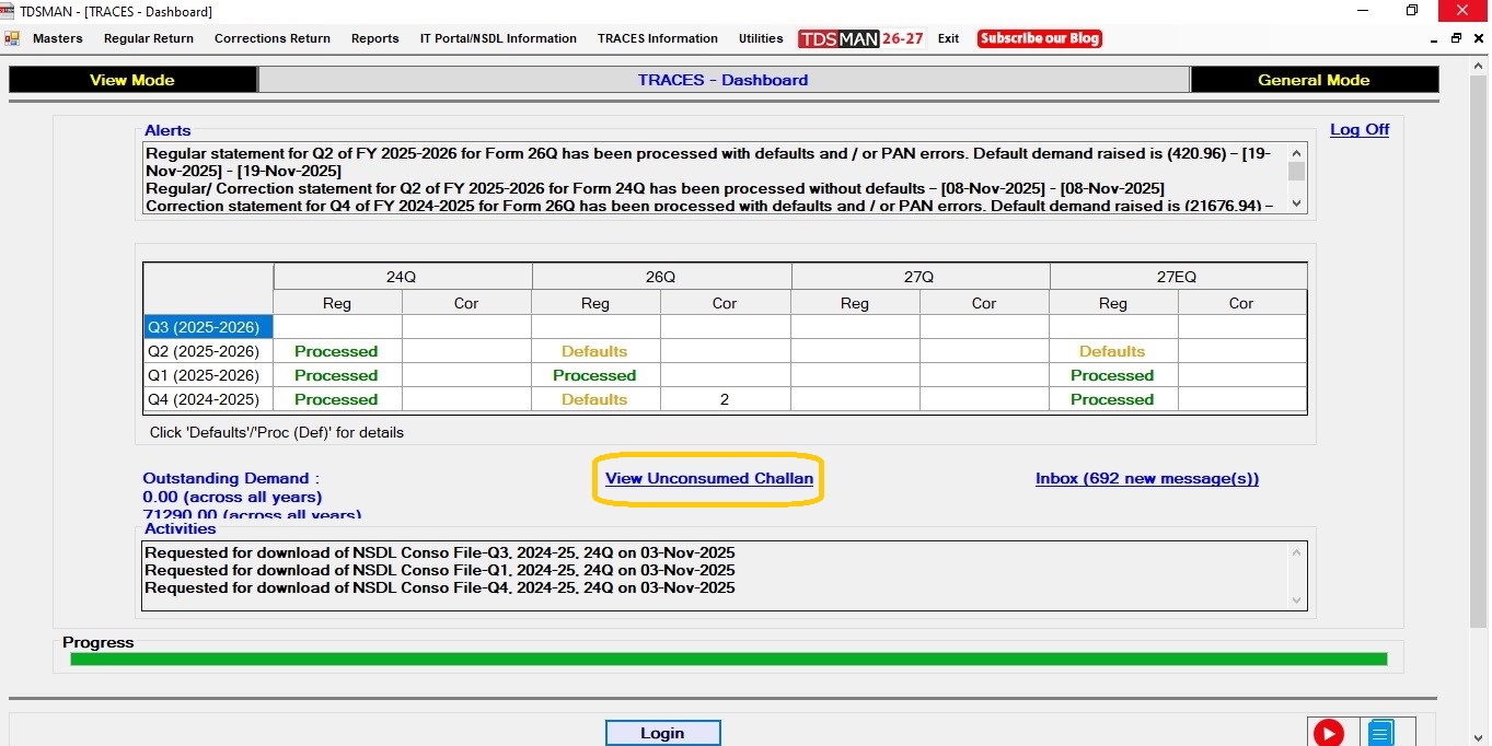 The TRACES portal provides a dashboard for tax deductors to view the overall activities in a snapshot. In this module, the content of this TRACES dashboard is extracted and displayed within TDSMAN in a simple and user-friendly interface.