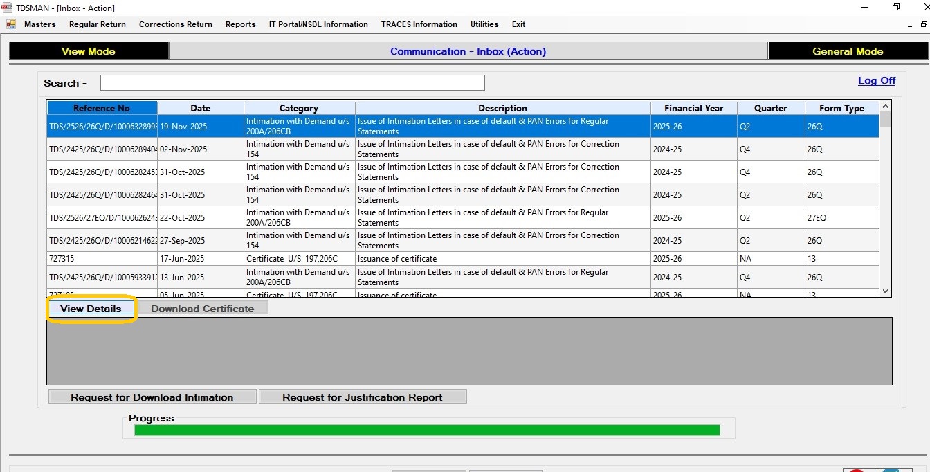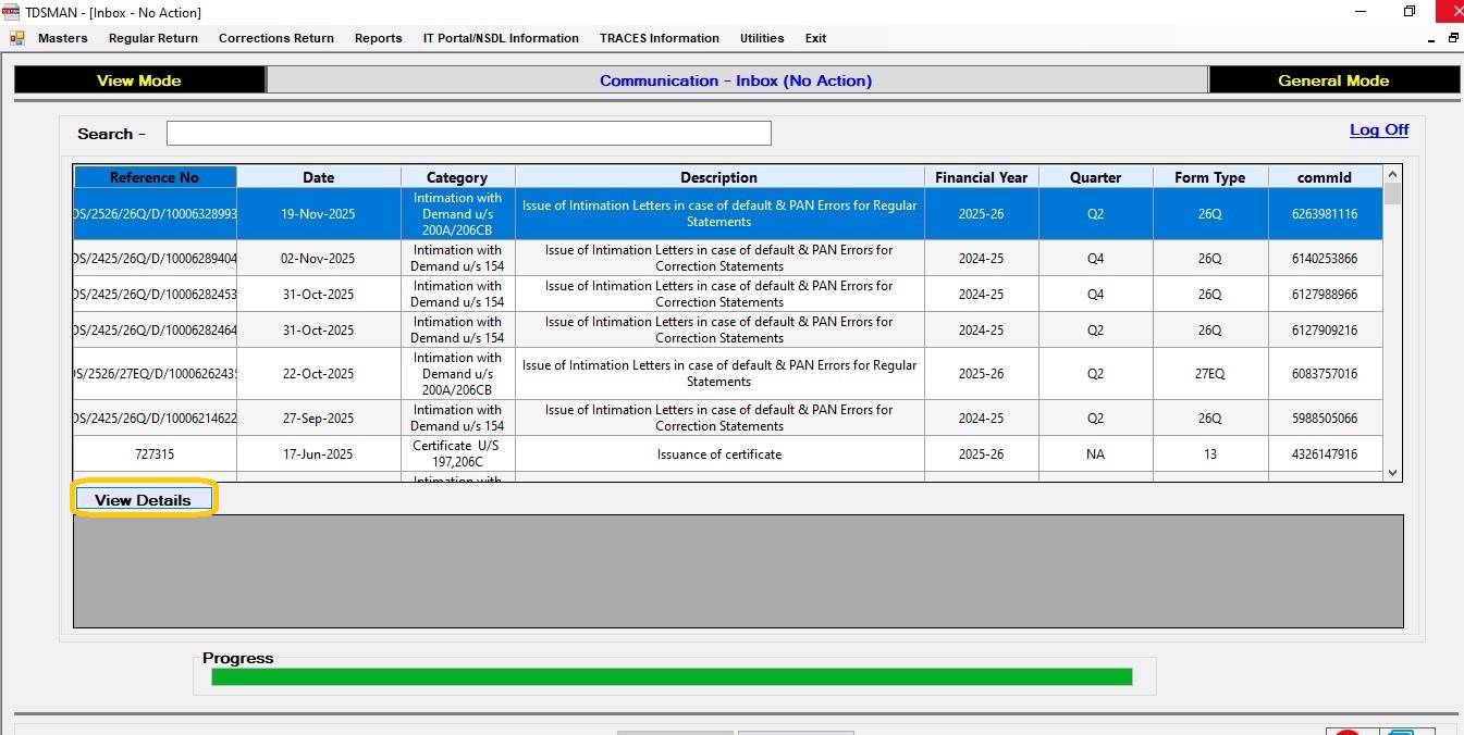 These communications are filtered on which ‘Action’ may be required. ‘Details’ can be viewed for each record by clicking on the option ‘View Details’.
