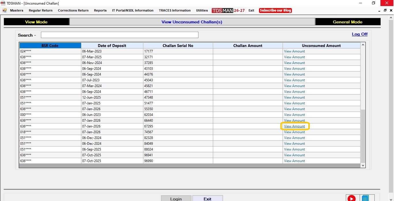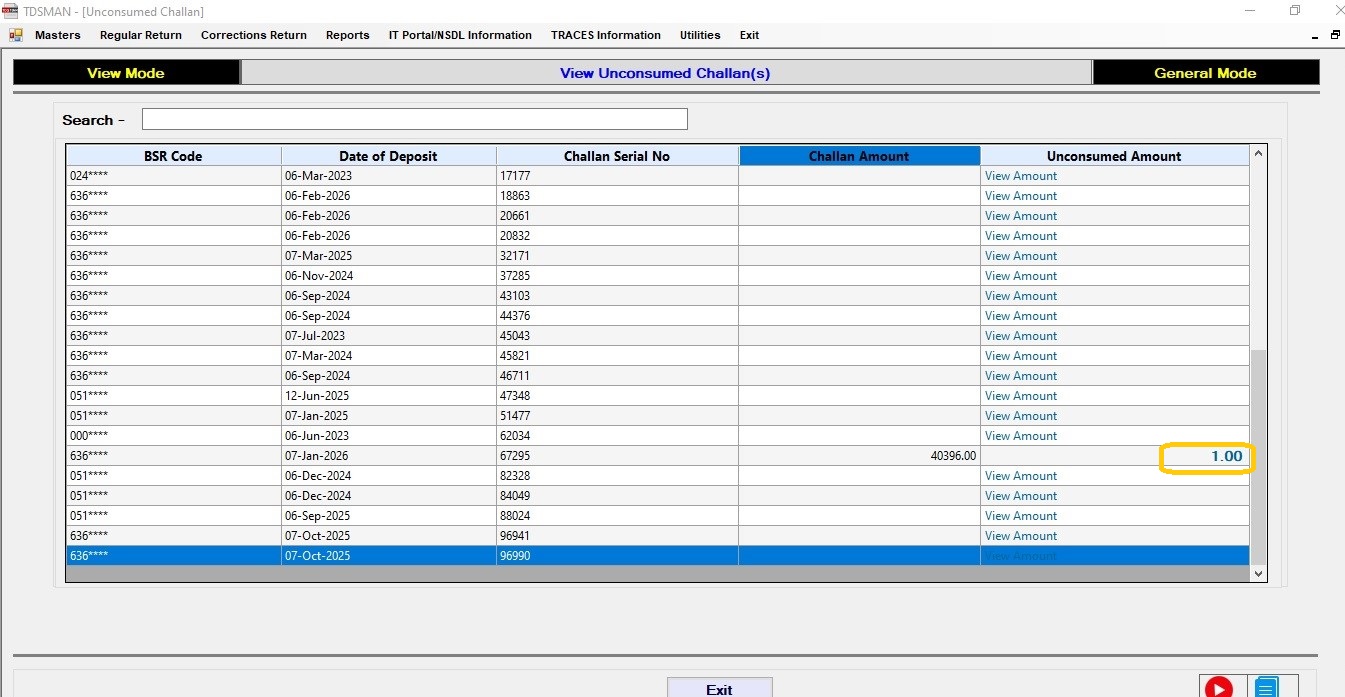 After due validation, the challan amount and the unconsumed value will be displayed in the last two columns.